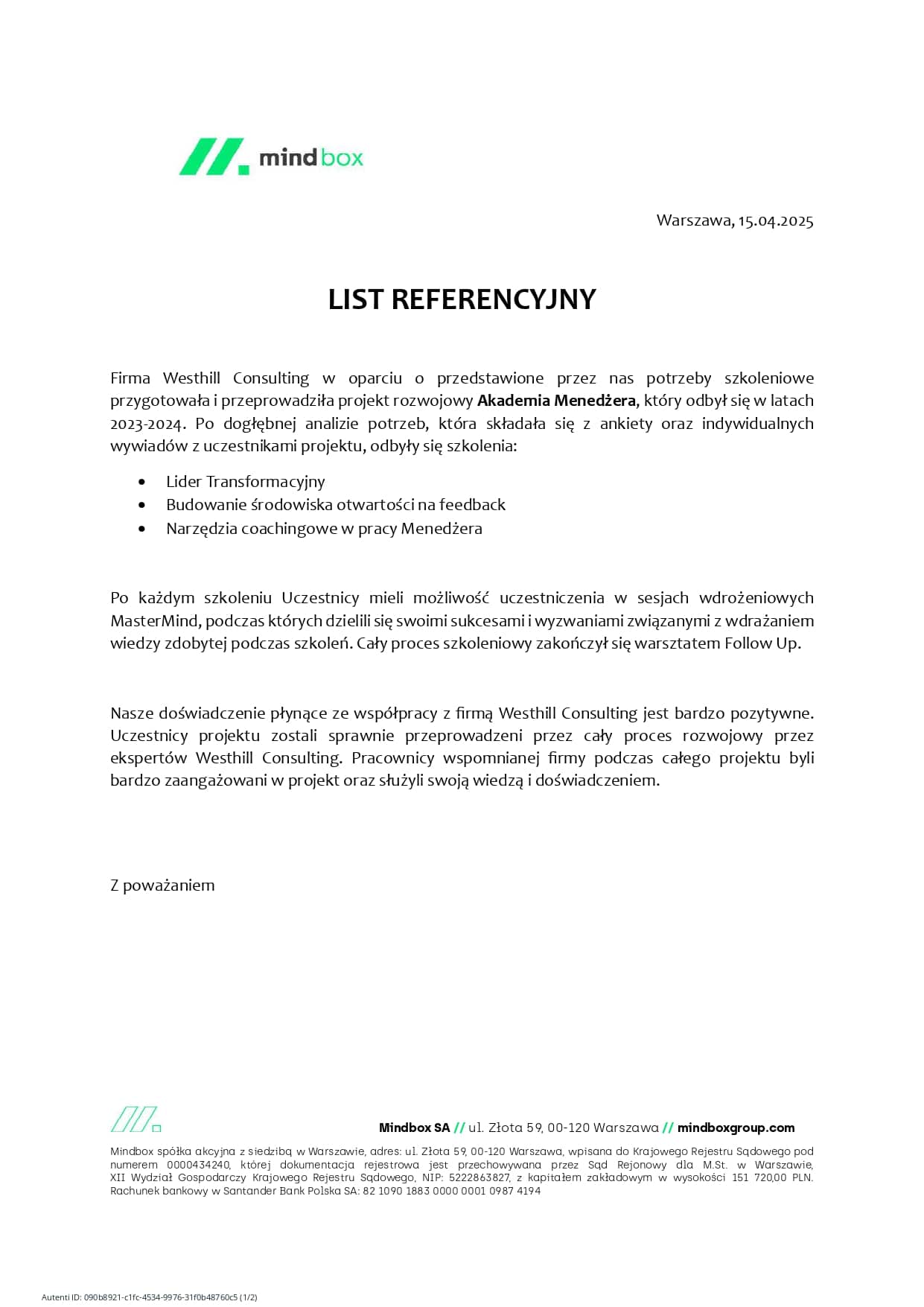 Współpracę z Westhill oceniam bardzo pozytywnie – to na co chciałbym zwrócić szczególną uwagę to elastyczność, która pozwoliła nam zbudować takie doświadczenie, które zostało ocenione bardzo pozytywnie przez naszych managerów .